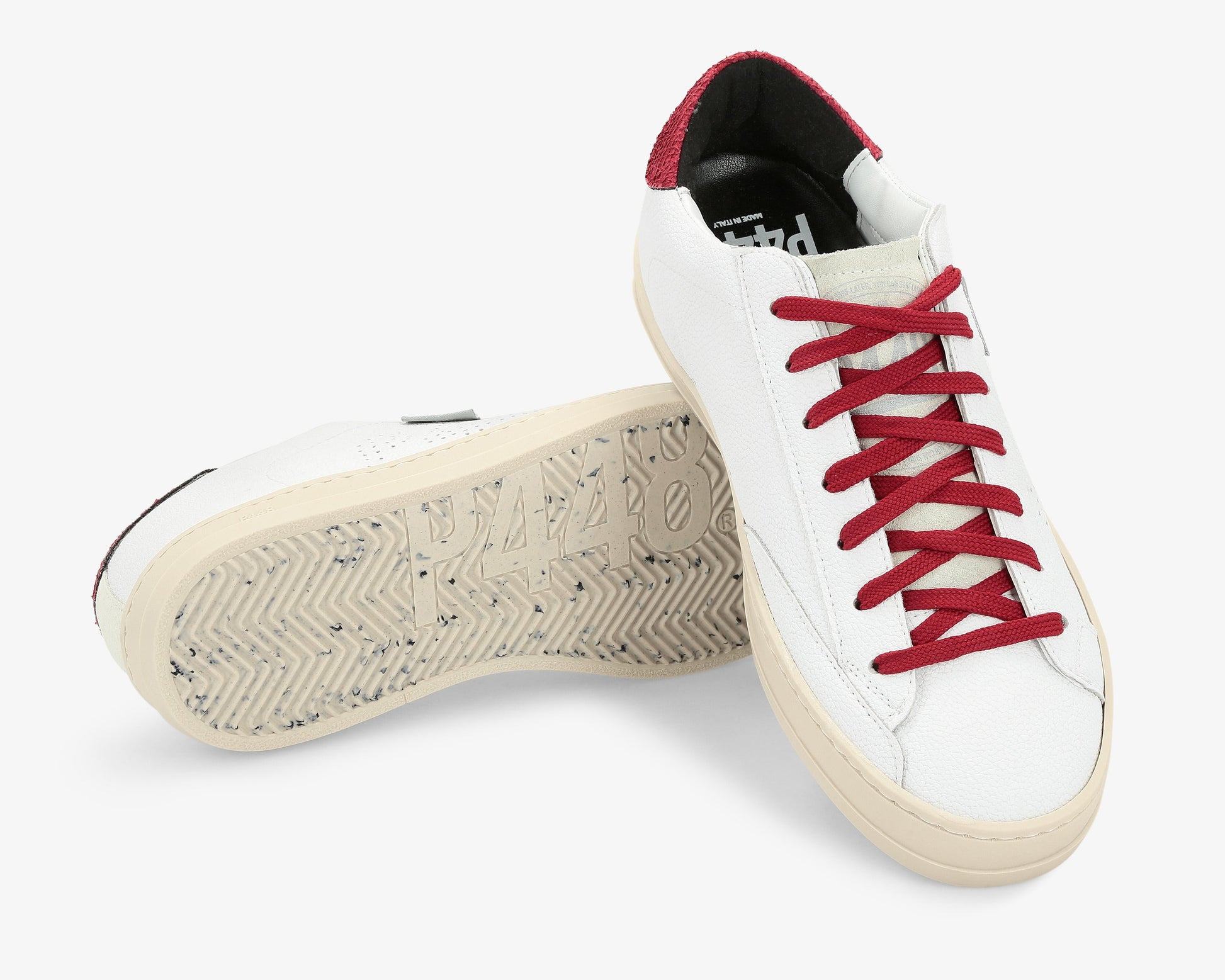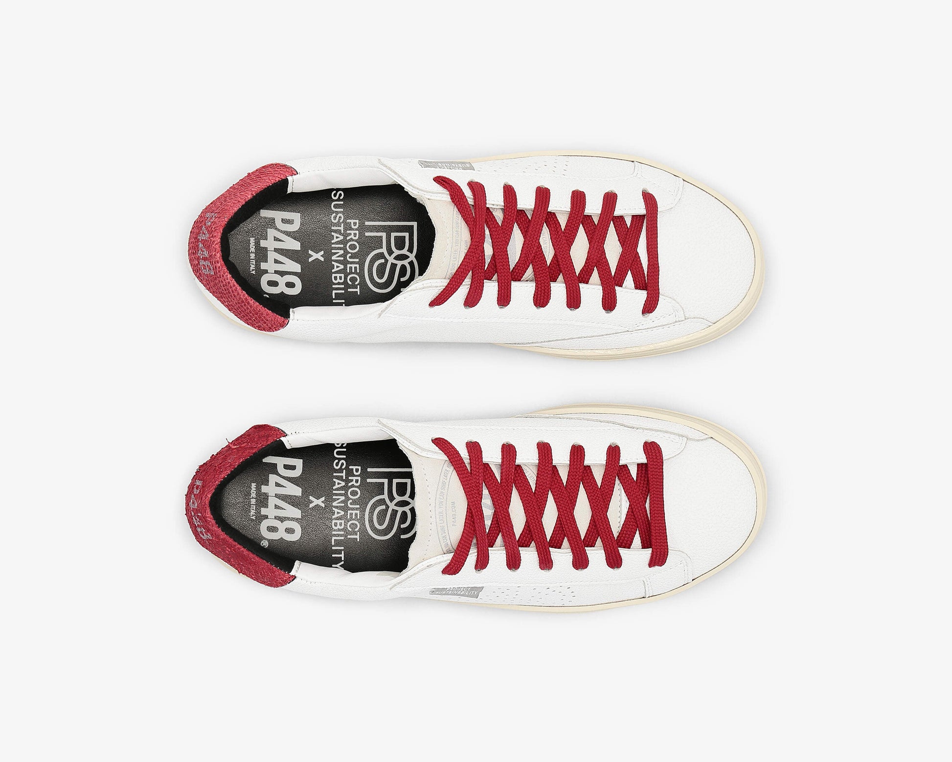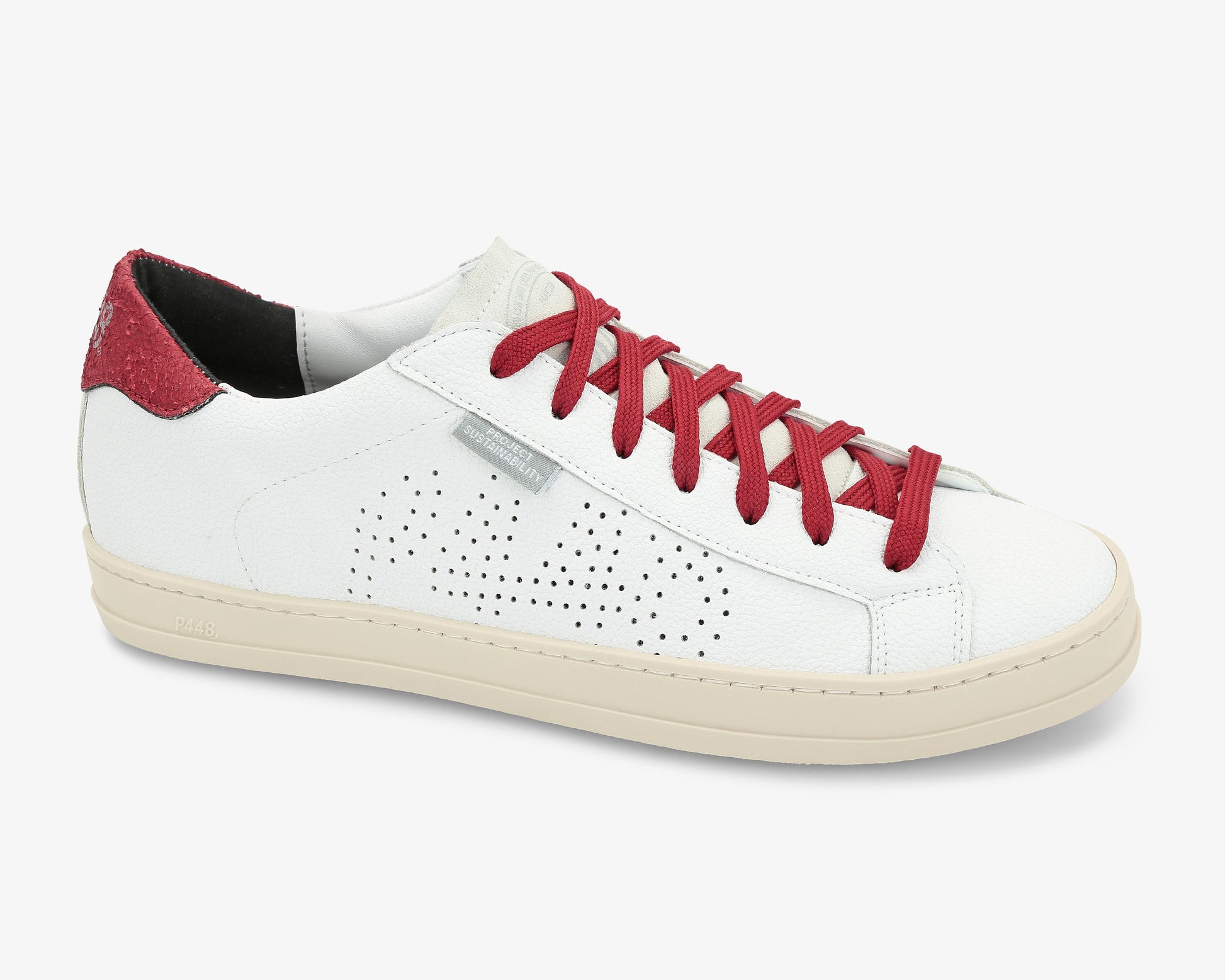 Meet the first-to-market collection of sneakers made from invasive species skins, part of our sustainability initiative, Project Sustainability™, and a step towards our commitment to making 30% of product offerings sourced from earth-conscious materials. Starting with our most-loved silhouette, the John, made with leather from the invasive Lionfish. The John Lionfish White/Lava features a white pebbled recycled leather upper, toe, & trim with an off-white recycled suede tongue, and anchored by a lava red lionfish skin heel tab with off-white suede accents. Finished with lava red recycled cotton laces.