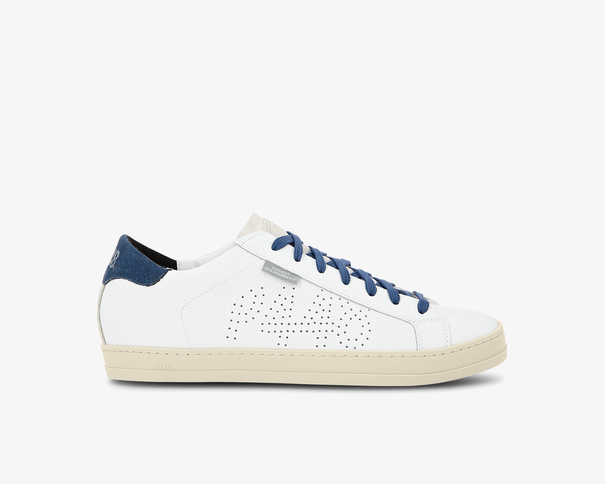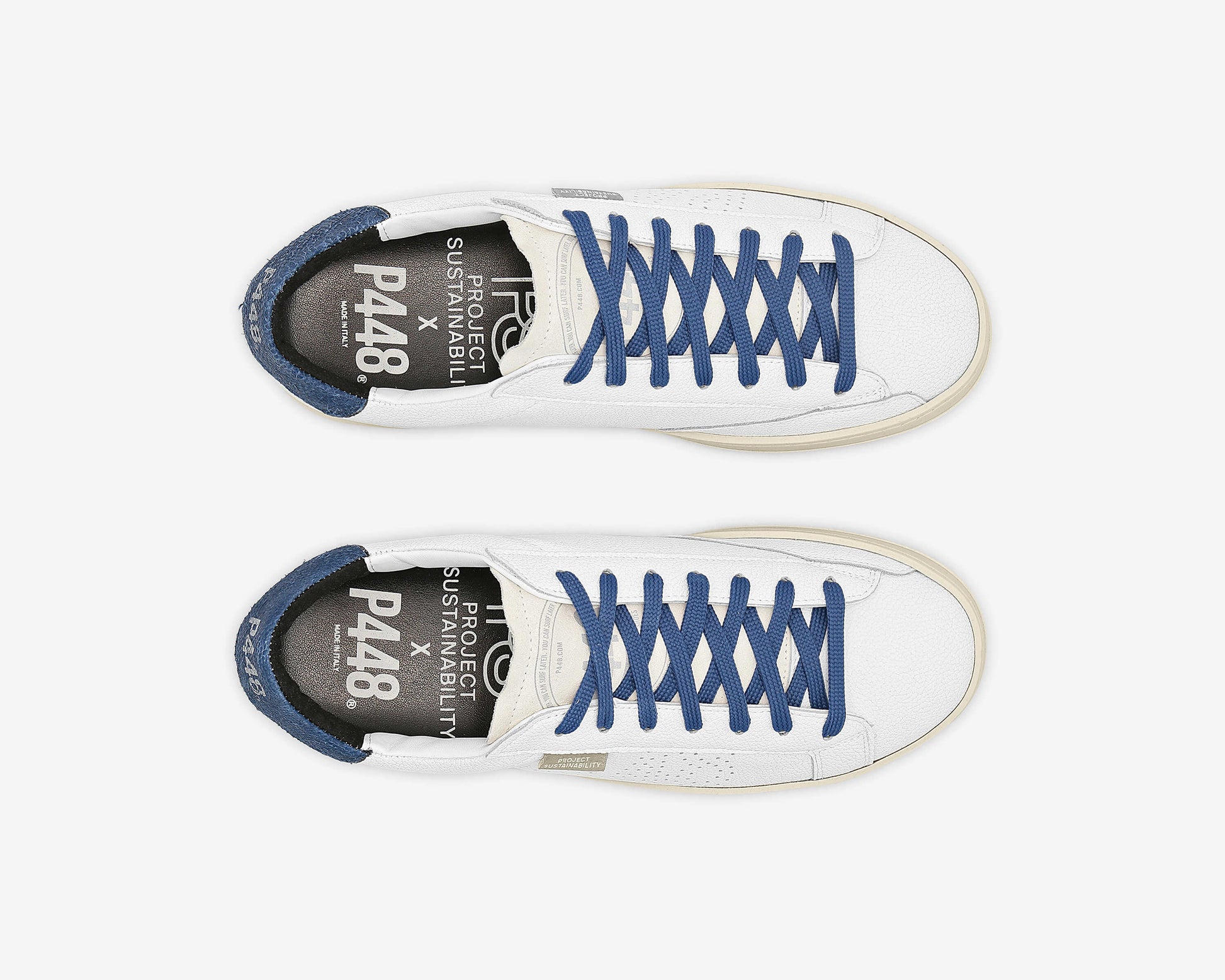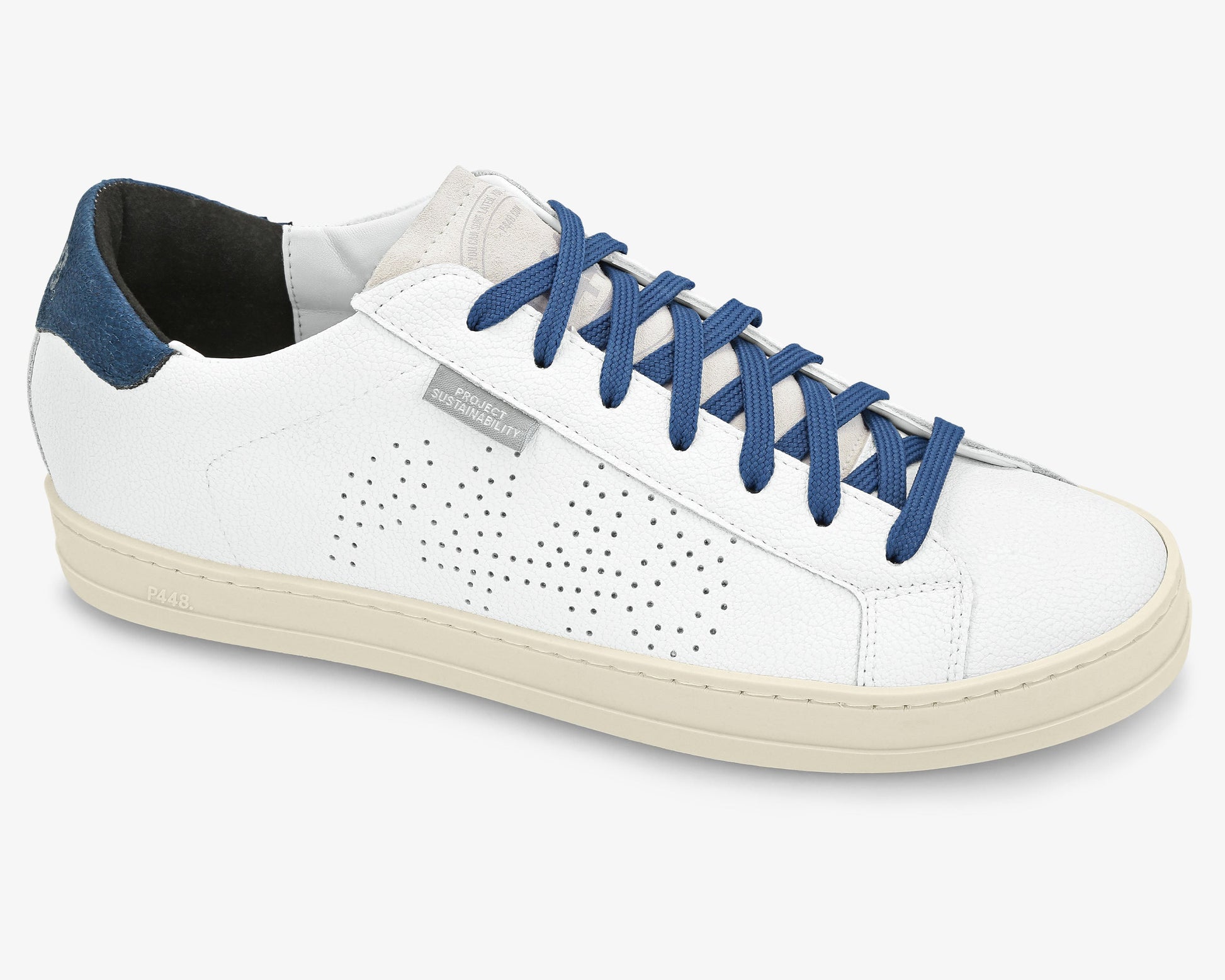Meet the first-to-market collection of sneakers made from invasive species skins, part of our sustainability initiative, Project Sustainability™, and a step towards our commitment to making 30% of product offerings sourced from earth-conscious materials. Starting with our most-loved silhouette, the John, made with leather from the invasive Lionfish. The John Lionfish White/Navy features a white pebbled recycled leather upper, toe, & trim with an off-white recycled suede tongue, and anchored by a classic P448 navy blue lionfish skin heel tab with off-white suede accents. Finished with navy blue recycled cotton laces.