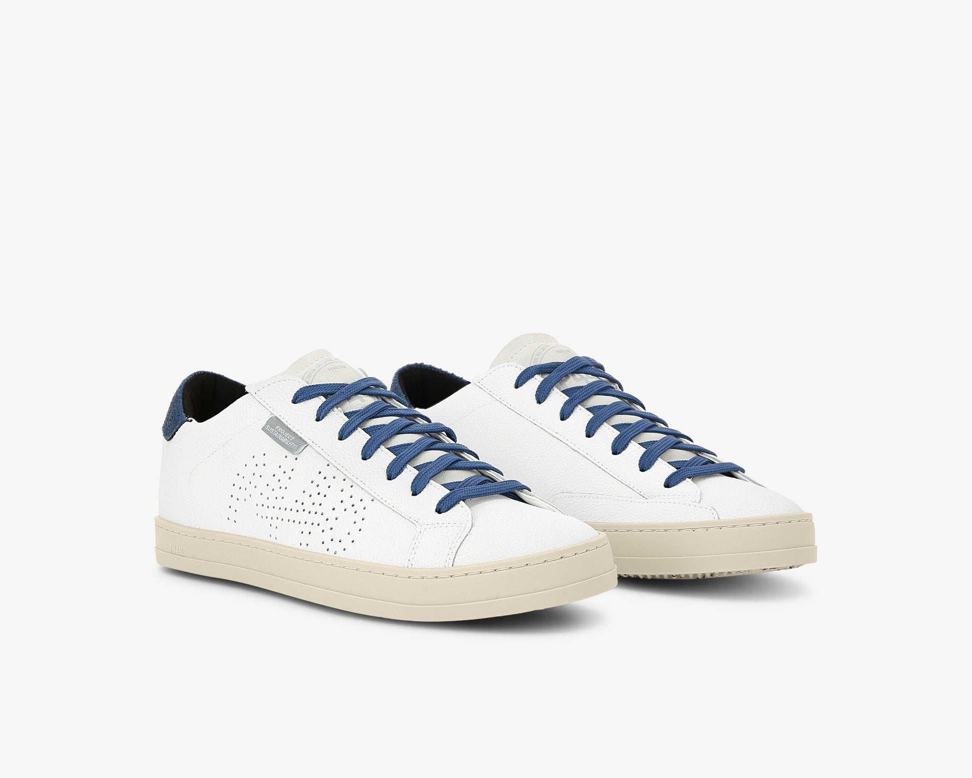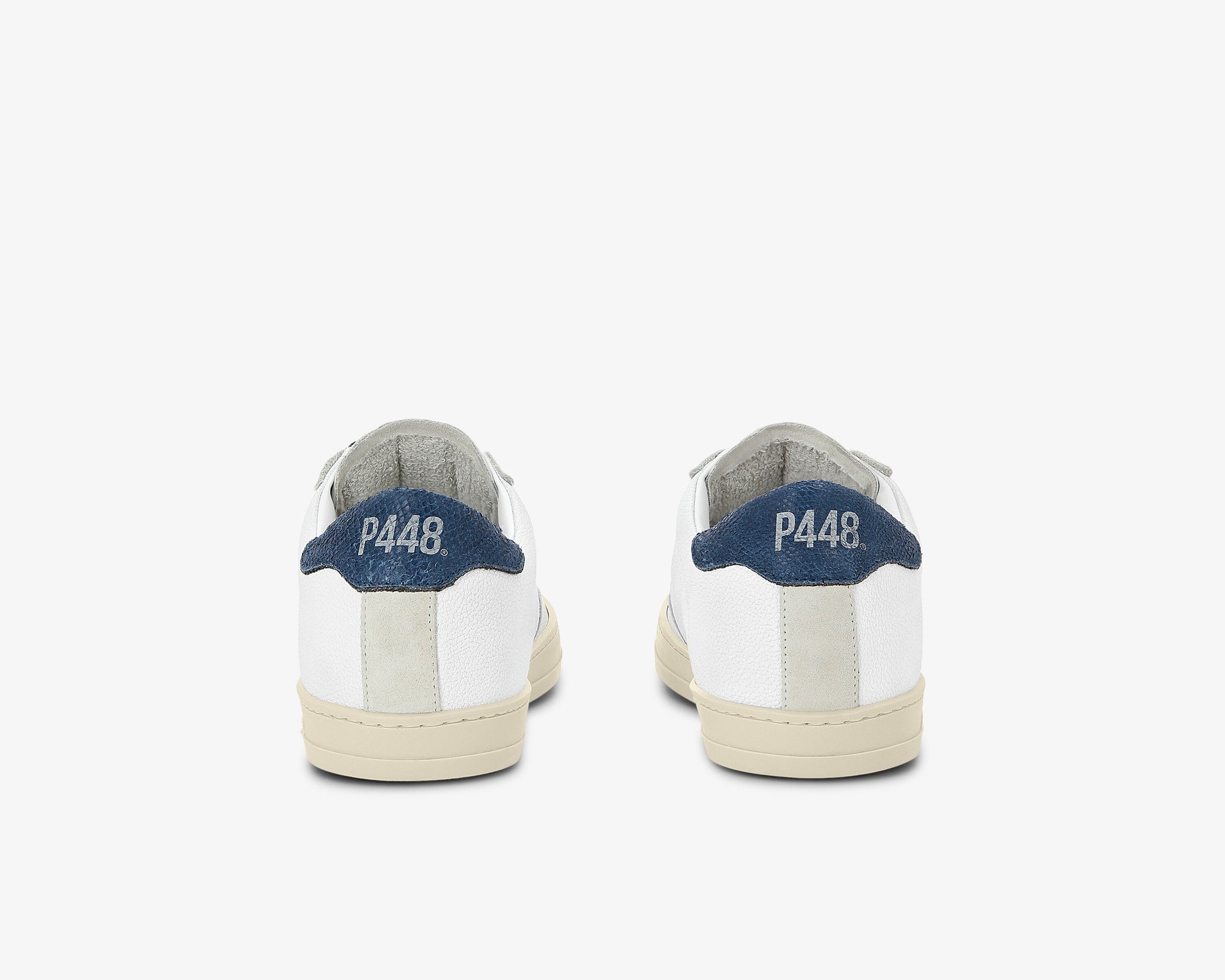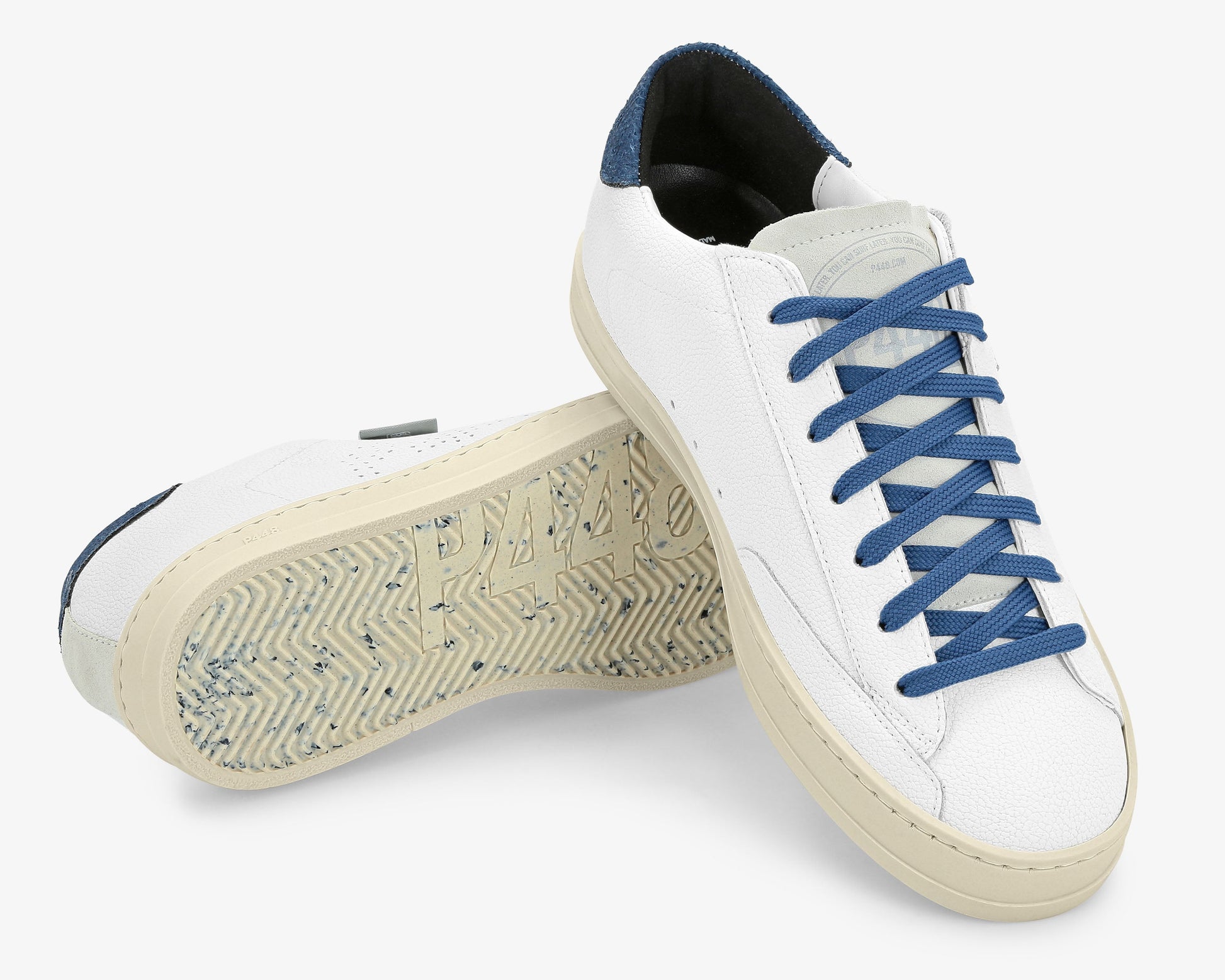 Meet the first-to-market collection of sneakers made from invasive species skins, part of our sustainability initiative, Project Sustainability™, and a step towards our commitment to making 30% of product offerings sourced from earth-conscious materials. Starting with our most-loved silhouette, the John, made with leather from the invasive Lionfish. The John Lionfish White/Navy features a white pebbled recycled leather upper, toe, & trim with an off-white recycled suede tongue, and anchored by a classic P448 navy blue lionfish skin heel tab with off-white suede accents. Finished with navy blue recycled cotton laces.